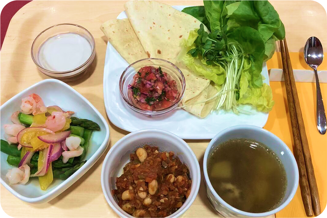 管理栄養士が提案するお食事を、患者さまに食べていただく体験プログラムです。野菜たっぷりでバランスのとれた、からだに優しくておいしい料理。