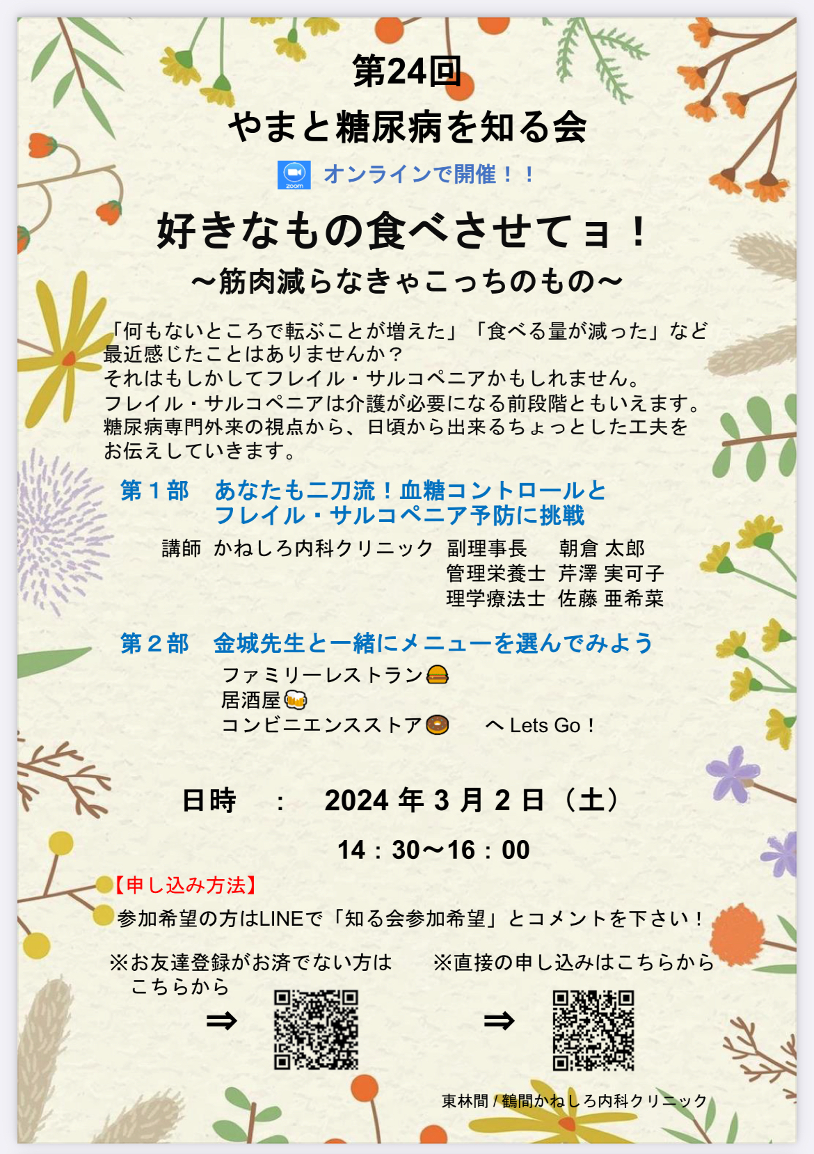 初めて糖尿病と診断された方、当クリニックで治療を始めた方を対象に「糖尿病とは」、「血糖値が上がりにくい食事法」、「合併症の予防法」などを医師から楽しく、詳しくお伝えします。
