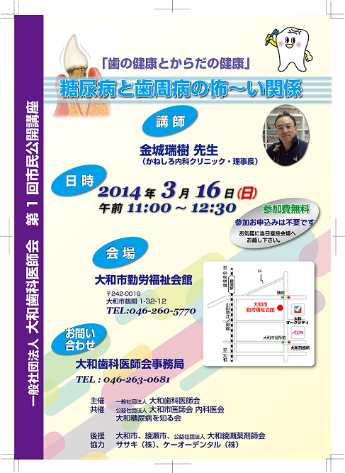 2014/02/24 (土) 3月16日(日)市民公開講座のお知らせ 大和歯科医師会主催の第1回市民公開講座が開催されます。 「糖尿病と歯周病の怖~い関係」をテーマに 金城が講演いたします。 参加費無料・参加申し込み不要です。 お気軽に当日直接会場へお越しください。 日時 2014年3月16日(日) 午前11:00~12:30 会場 大和市勤労福祉会館 〒242-0018 大和市鶴間1-32-12 TEL 046-260-5770