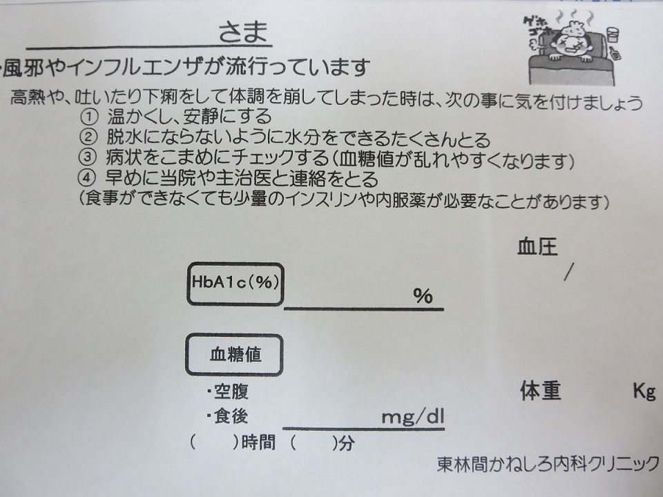 2014/02/21 (土) 今回のテーマは・・・ 当院では採血された方に、 採血結果(HbA1c等)の用紙をお渡ししています。 その用紙には、結果とともに 患者様に気にかけていただきたい事柄が記載してあります。 今回は “体調をくずした時の注意点” です。 内容は2~3ヶ月ごとに更新しています。