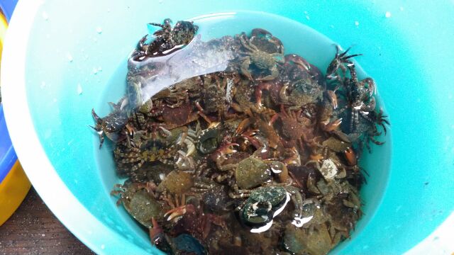 「ママ、この石の下にいっぱいカニがいそうだよ。」