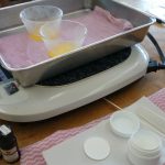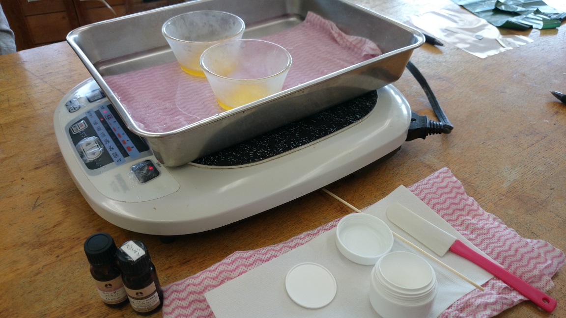 みつろうとホホバオイルを湯煎で溶かし、自分の好きなアロマオイルを加えて