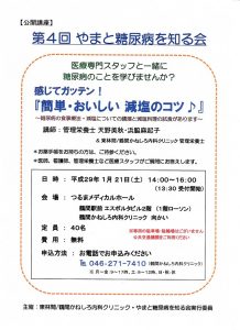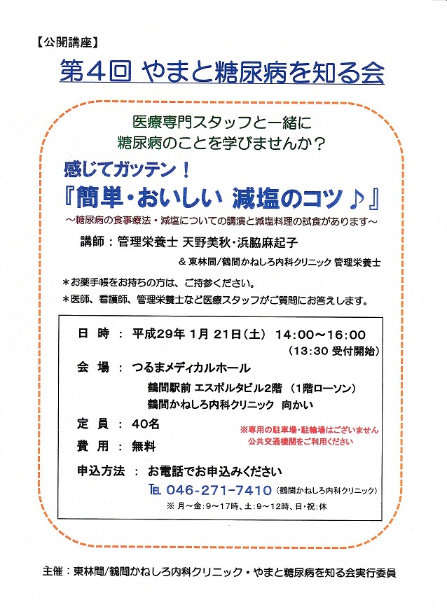 2016/12/13 (土) 第4回 やまと糖尿病を知る会 第4回 やまと糖尿病を知る会を開催致します。 平成29年1月21日(土)14時から16時、つるまメディカルホールにて行います。 『簡単・おいしい 減塩のコツ♪』 ~糖尿病の食事療法や減塩についての講演と試食があります~ 参加費は無料です。 参加希望の方は鶴間かねしろ内科クリニックまでご連絡ください。 電話番号:046-271-7410