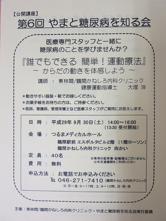 2017/08/30 (土) 第6回 やまと糖尿病を知る会のお知らせ 来たる9月30日(土)、つるまメディカルホールにて 『誰にでもできる 簡単! 運動療法』 ~からだの動きを体感しよう~ 講師:健康運動指導士 大塚洋 が開催されます。 日頃の運動不足を解消しにいらっしゃいませんか? 無料!ですので、ぜひお気軽にご参加くださいませ。 申し込みのお電話お待ちしておりますm(_ _)m ℡046-271-7410(鶴間かねしろ内科クリニック) ぱーな 神奈川県相模原市、大和市、東林間、鶴間 かねしろ内科クリニック 糖尿病・脂質異常症・肥満専門外来・甲状腺専門外来