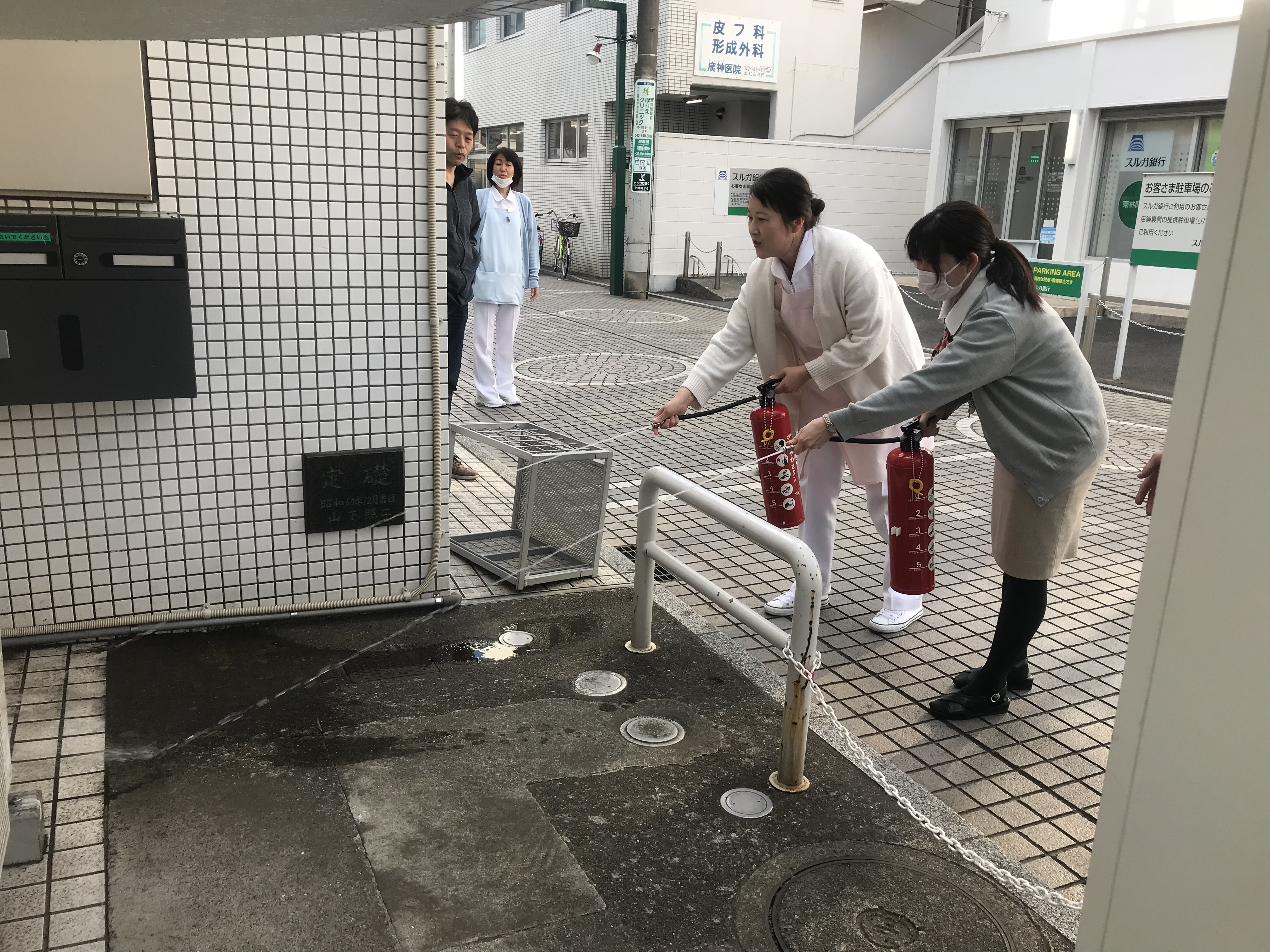 先日、毎年定例となっている防災訓練を実施しました。東林間では火災報知機の点検や使い方、消化器や、懐中電灯などの位置確認、非常物品や非常食の保管場所を各階ごとに確認しました。最後は、(練習用)消化器を使って放水しました。