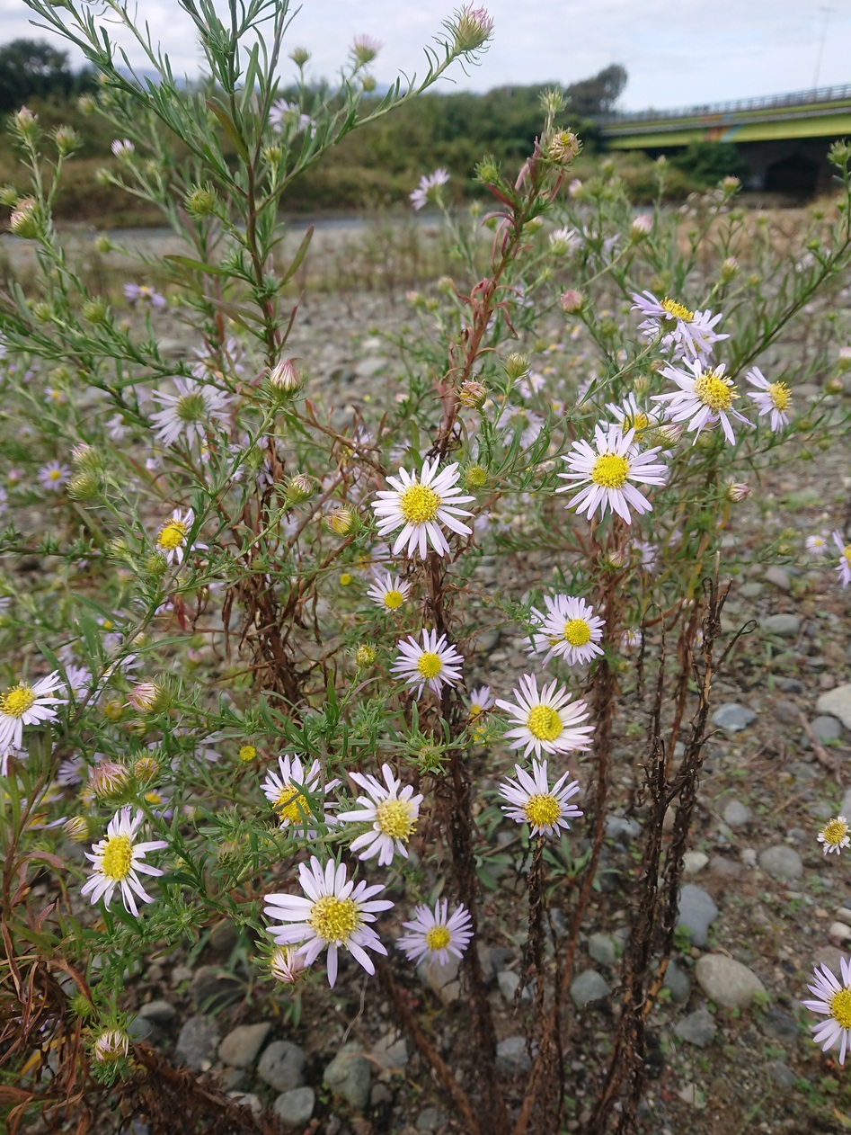 少し前になりますが、河原の美化活動に参加した際にカワラノギクが咲いていました。カワラノギクは関東の相模川、多摩川、鬼怒川などの一部水系の河原にのみ自生するキク科の二年草です。絶滅危惧種として相模川水系では保全活動が行われています。自宅近くの河原でも保全活動が行われているので、カワラノギクを見る機会に恵まれています。