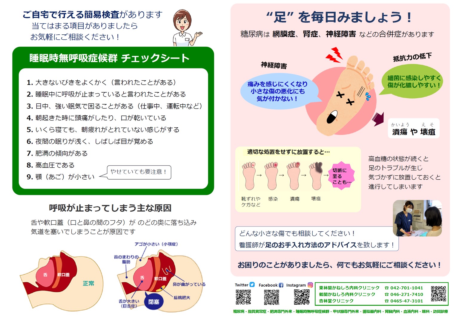神奈川県相模原市、大和市、東林間かねしろ内科クリニック、鶴間かねしろ内科クリニック、糖尿病・脂質異常症・肥満専門外来・睡眠時無呼吸症候群・甲状腺専門外来・循環器内科・腎臓内科・血液内科・眼科・訪問診療