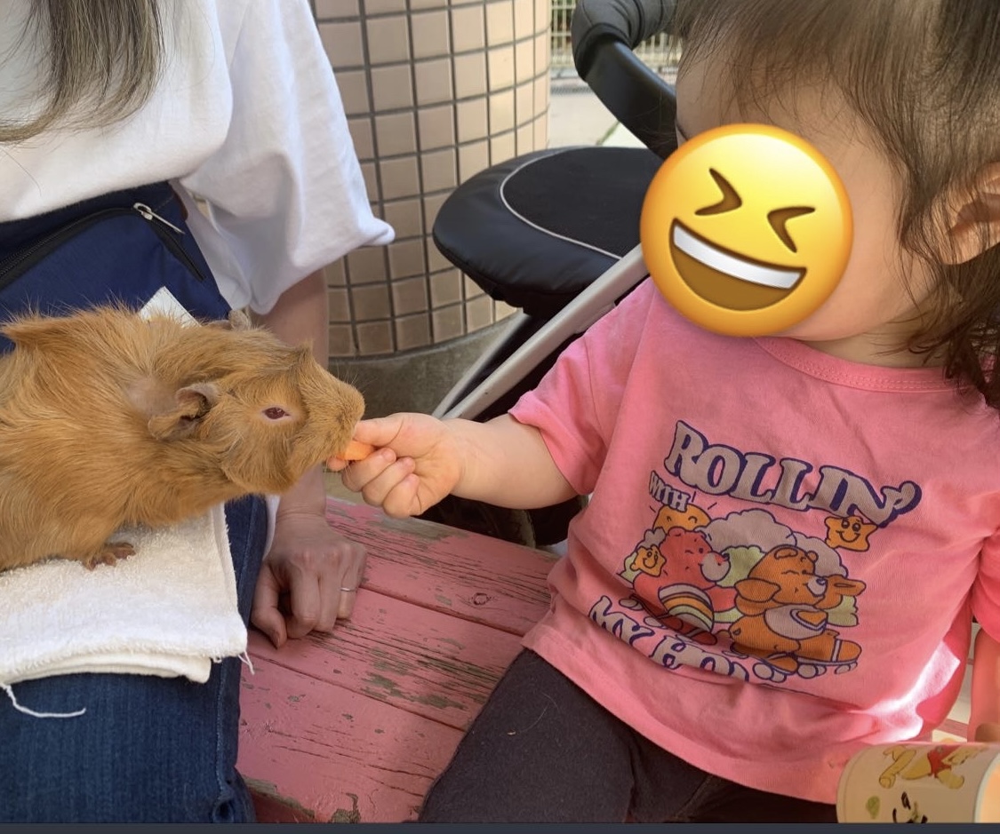 ポニーやヤギ、ヒツジ、モルモットなどと触れ合い初めての餌やり体験をしました。