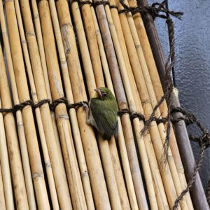 さらにもう一羽、こどもと思われる小さい子が飛んできて、なんと縁側の葦簾に止まりました😊