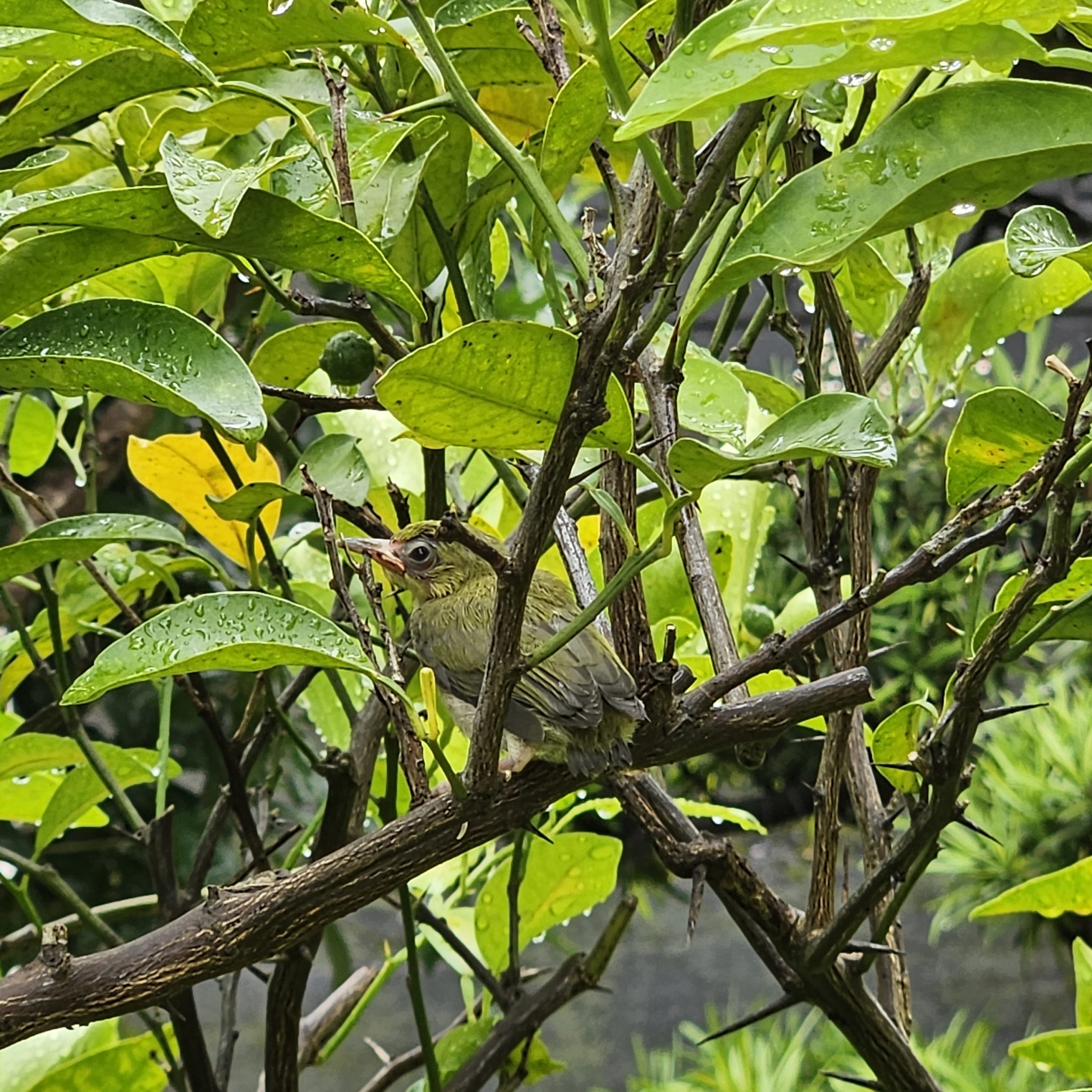 お休みの日、自宅のリビングのソファーに座って雨上がりの庭を眺めていると、チュルチュルチュル🎵という鳥のさえずりが聞こえてきました。