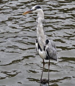 数羽のカモや鯉の群れが子ども達が投げたエサに群がる中、微動だにせず、悠々と貫禄さえ感じる様子で止まり木にじっと佇んでいました。