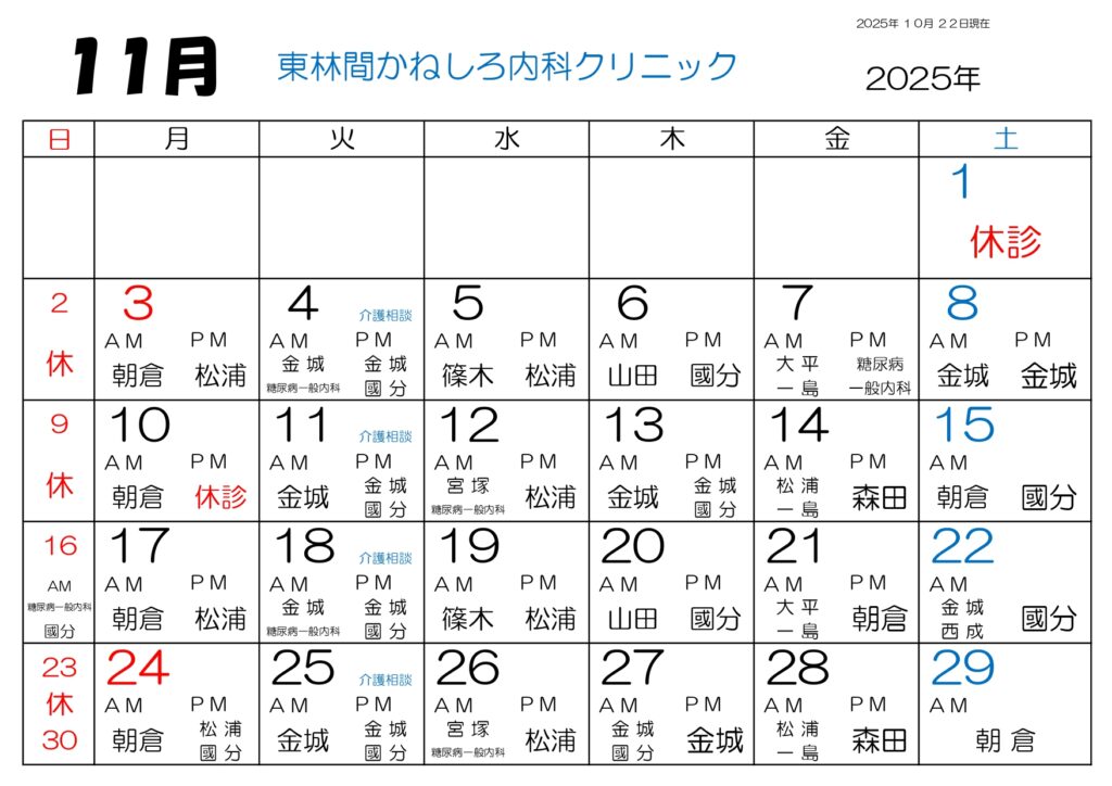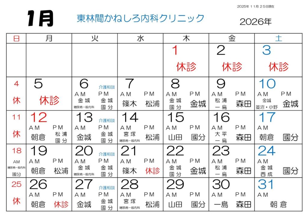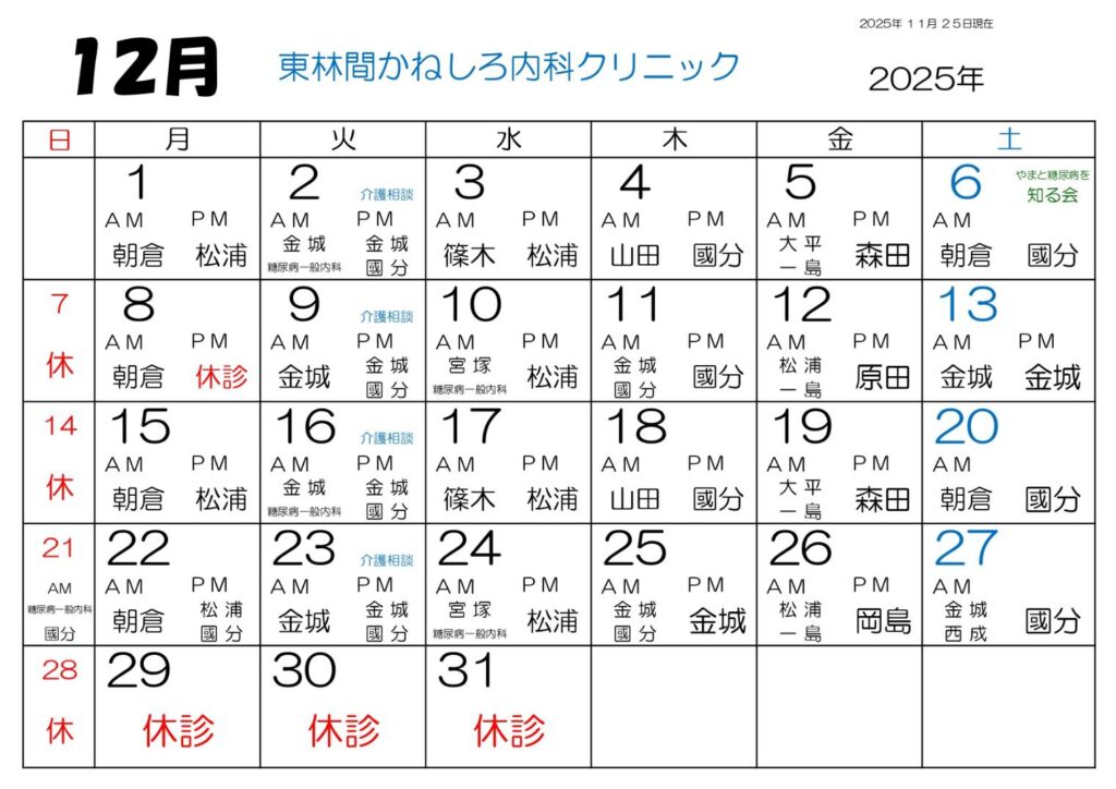 診療カレンダー(東林間かねしろ内科クリニック)